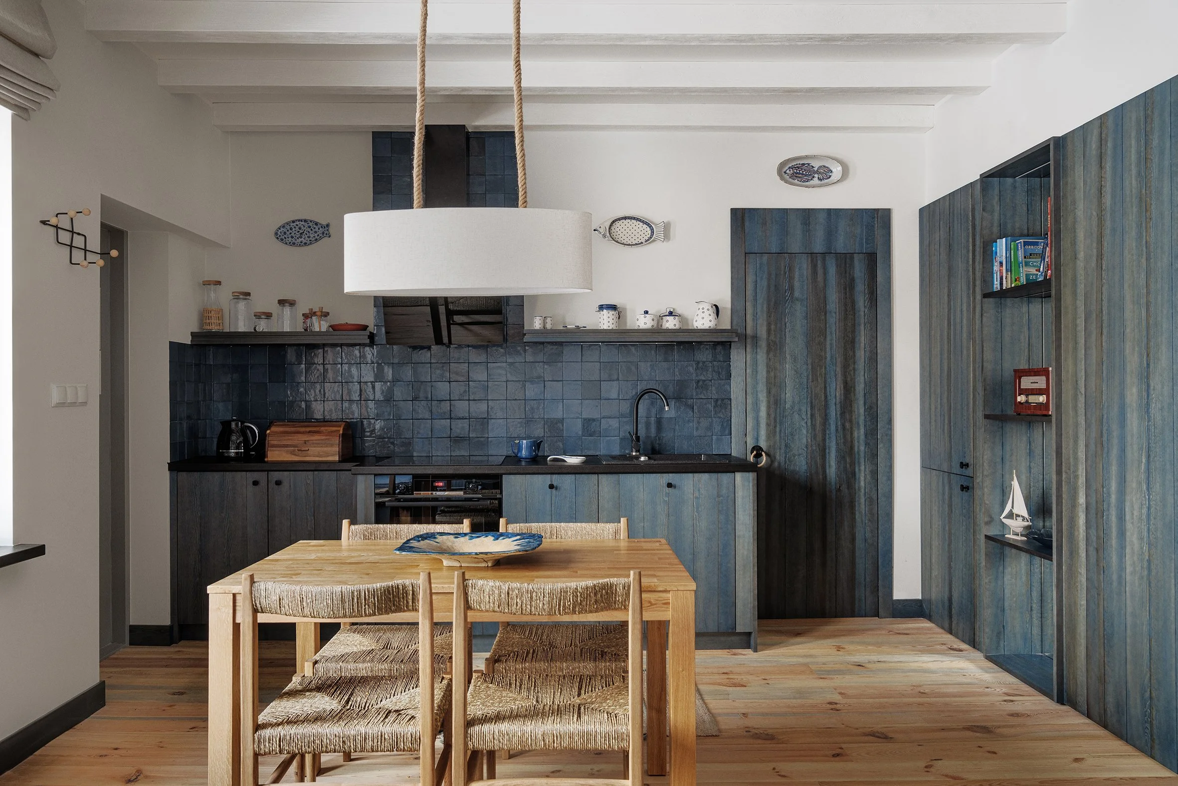The primary bedroom's shower room features blue zellige tiles from Marazzi.